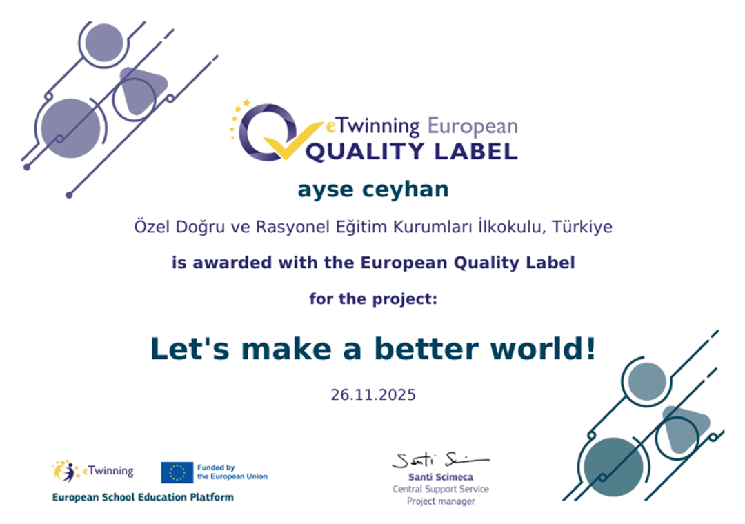 2025–2026 eğitim-öğretim yıllarında yürüttüğümüz “Let’s Make a Better World” projemizle, Dore Okulları olarak uluslararası düzeyde önemli bir başarıya imza attık. Öğrencilerimizin aktif katılımıyla gerçekleştirilen bu proje, yenilikçi yaklaşımı ve evrensel değerleri temel alan yapısıyla Avrupa Kalite Etiketi almaya hak kazandı.